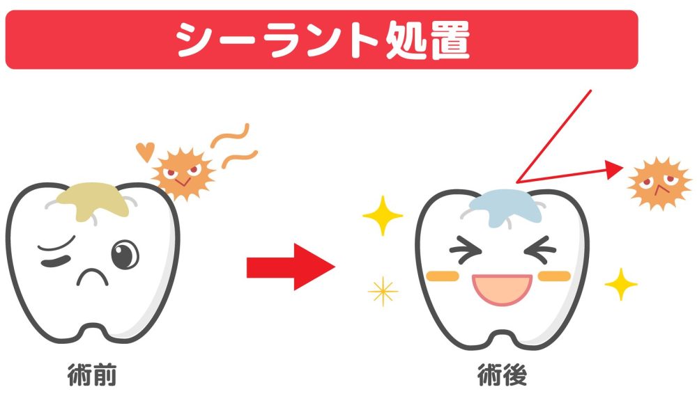 お子さまの奥歯は複雑な溝があり、歯ブラシが届きにくいためむし歯になりやすい傾向にあります。シーラントは子どもの奥歯の溝を白いプラスチック素材で埋める虫歯予防法です。シーラントで、溝を埋めることで、むし歯のリスクを軽減できます。シーラントが欠けると、むし歯になる可能性が高くなりますので、定期的に検診を受けるようにしましょう。